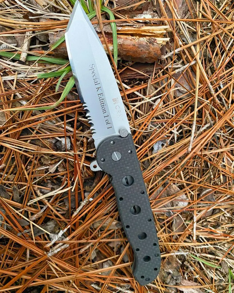 Columbia River CRM16-14F carbon fiber knife with half serrated and Tanto blade. Special engraving per our customer’s instruction.