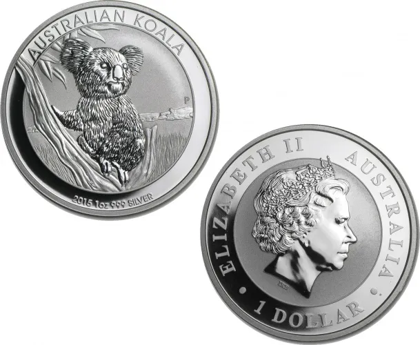 Gold and Silver products 2015_AUSTRALIAN_SILVER_KOALA_1_OZ Item Description:Acquire a tangible piece of Australian wildlife with the 2015 Australian Silver Koala 1 oz Coin from Gold and Silver Products. This coin features the iconic koala in stunning detail, struck in .999 fine silver and presented in a protective capsule to preserve its pristine condition. The 2015 Koala is a valued addition to any collection, offering both beauty and intrinsic metal worth. Secured within its capsule, this coin is a testament to the Perth Mint's exceptional craftsmanship and Australia's unique fauna.