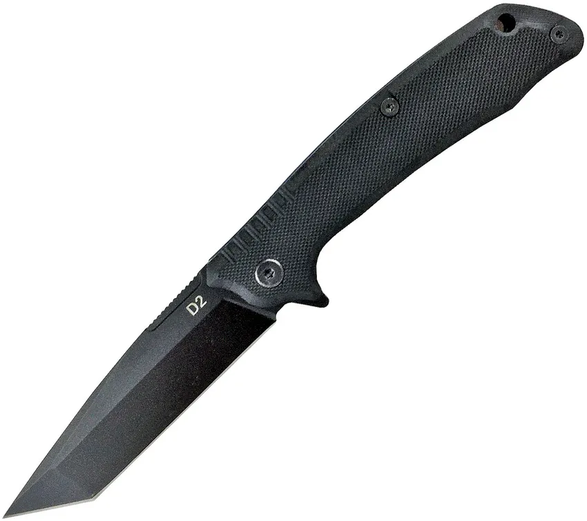 4.75" closed. 3.75" black stonewash finish D2 tool steel tanto blade. Black G10 handle. Extended tang. Pocket clip. Lanyard hole. Blue stainless liners. Boxed.