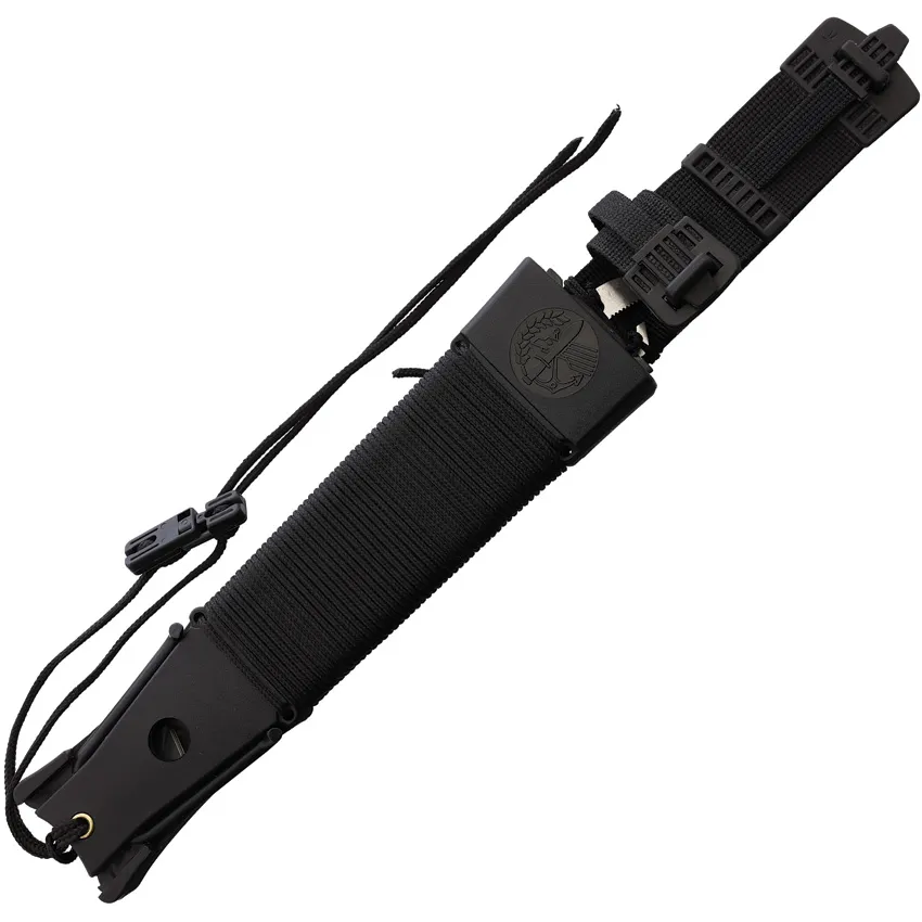 14.25" (36.2cm) overall. 8" (20.32cm) black powder coated stainless sawback blade. Black knurled stainless handle. Stainless guard and pommel. Pommel unscrews to reveal a compass inside cap and small survival kit stored in clear acrylic tube in handle. O-ring sealed. Black nylon sheath also stores a 7" overall skinner with 2.5" guthook blade, and pullout tray with latex powerbands for slingshot. Back of tray features ruler, S. O. S. Signals and signaling mirror. Outside of sheath features several feet of black nylon cord, black coated stainless metal arms at tip of sheath that flip out to serve as slingshot, and a sharpening stone on the back.