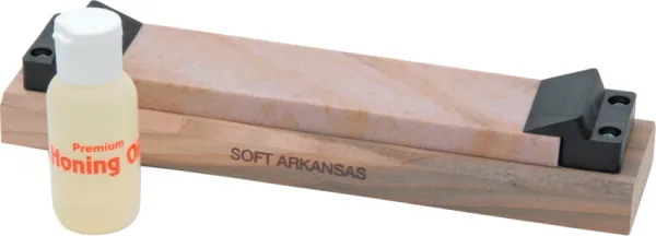 Arkansas Soft Stone Measures 7 x 1 3/4". Mounted on wood block with angle guides at each end. Comes with small bottle of honing oil." Dimensions: 7" x 1.75". Mounted on wood block with angle guides at each end. Comes with small bottle of honing oil.