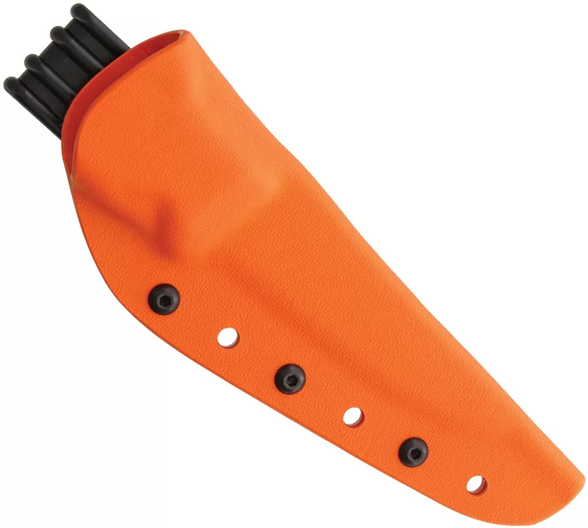 Orange Kydex sheath with belt clip. Substantial drain hole and plenty of clearance for the blade. Bulk packed.