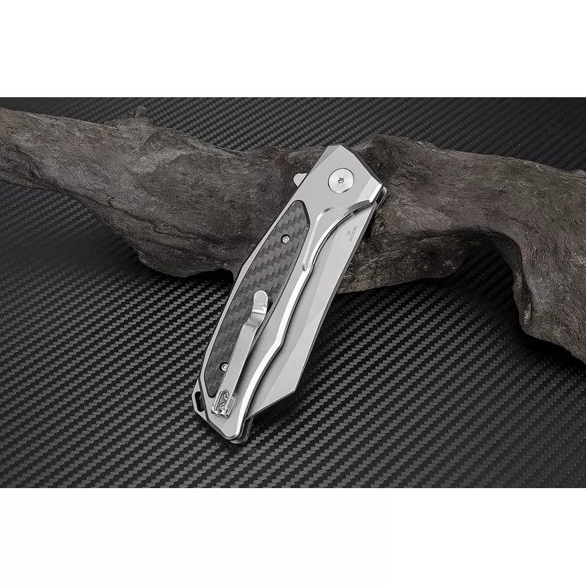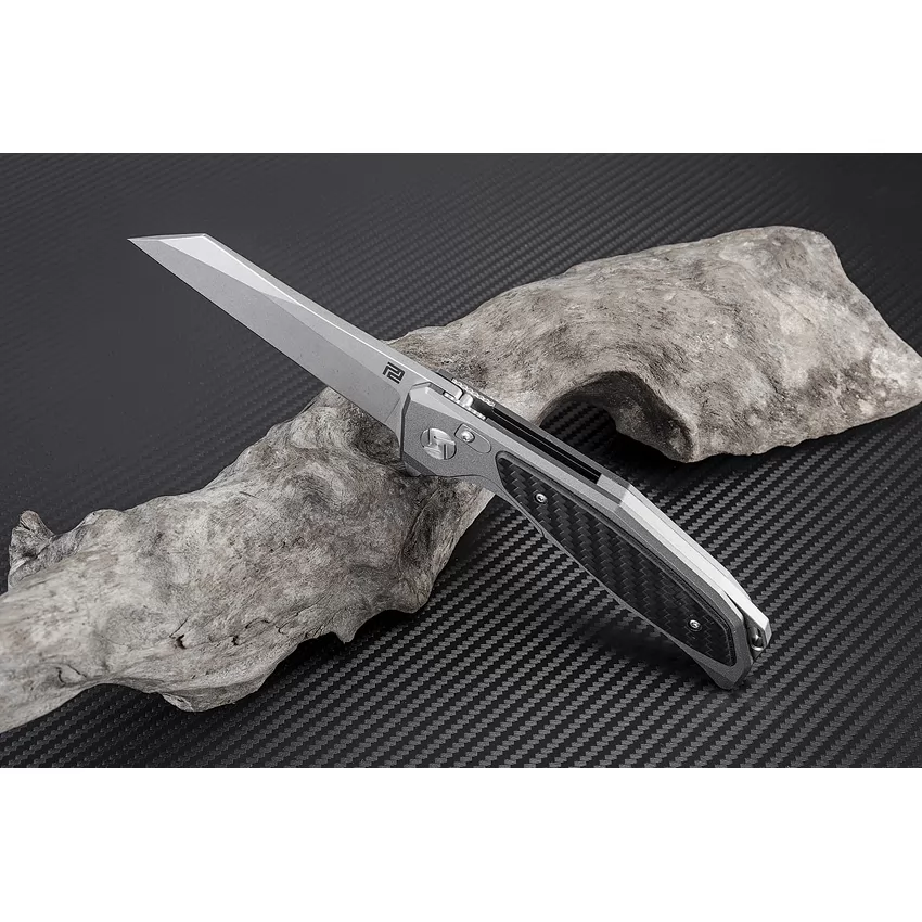 The Artisan Cutlery Megahawk Linerlock (ATZ1809PGCF) delivers exceptional cutting performance with its D2 tool steel blade, ensuring durability and edge retention. Its striking gray carbon fiber handle provides a secure and comfortable grip, while the reliable liner lock mechanism guarantees safe and confident use. This design, crafted by Artisan, offers a robust and stylish everyday carry option for those who value precision and premium materials. 5" closed. 3.75" stonewash finish D2 tool steel modified tanto blade. Gray aluminum handle with carbon fiber inlay. Extended tang. Lanyard hole. Pocket clip. Boxed.