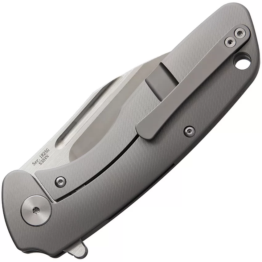 4.5" closed. 3" satin finish S35VN stainless blade. Gray anodized titanium handle. Extended tang. Lanyard hole. Pocket clip. Metal tin. Black nylon zippered storage case. Boxed.