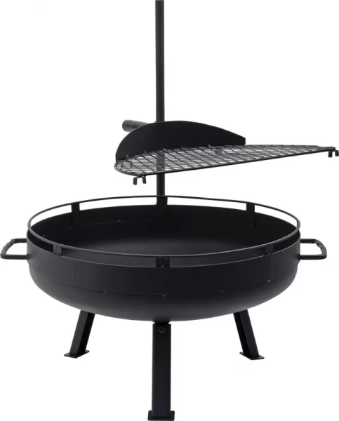 Fire Bowl Dimensions: 23.75" x 23.75" x 8.15". Fire Bowl height with legs: 14.5". Height with upright pole: 33.38". Modular design allows for multi-use as fire pit and open-fire grilling/cooking station. Signature twisted steel handles. Adjustable height and track system helps control heat on the grate. Portable and easy to setup. Comes with grill, pole, and grate. Steel construction. Boxed.