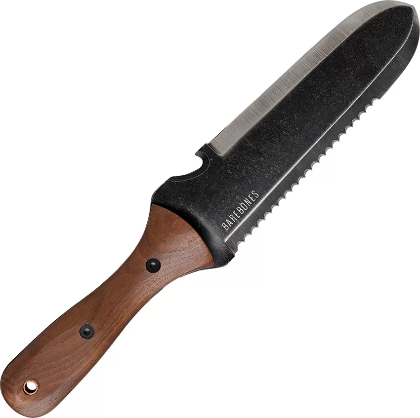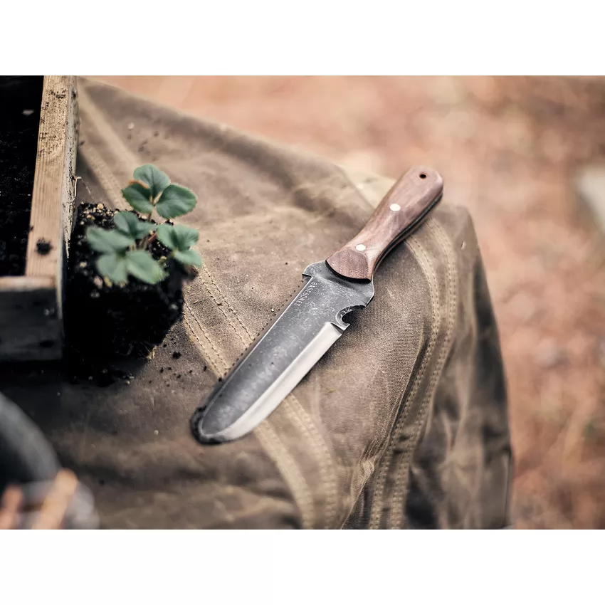 The Barebones Living Garden Hori-Hori Classic (BARE046) is a versatile tool for any gardener. Crafted with a durable, heat-treated boron steel blade and a comfortable walnut handle, this knife expertly handles digging, planting, weeding, and transplanting. The concave blade, sharpened edge, and depth markings make it perfect for various tasks around the garden, while the included canvas sheath keeps it protected when not in use. This Hori-Hori ensures lasting performance and becomes an essential companion for tending to your outdoor space. 12.75" (32.39cm) overall. 6.75" (17.15cm) black stonewash finish stainless blade. Walnut handle. Full tang. Lanyard hole. Heat treated double edge (straight and serrated) blade. Integrated twine cutter and bottle opener. Sheath sold separately (BARE080). Hang packaged.