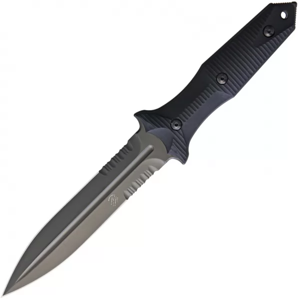 11" overall. 6" black PVD coated partially serrated Bohler N690 stainless spear point blade. Black G10 handle. Full, extended tang. Lanyard hole. Double edge blade. Black Kydex belt sheath. Boxed.