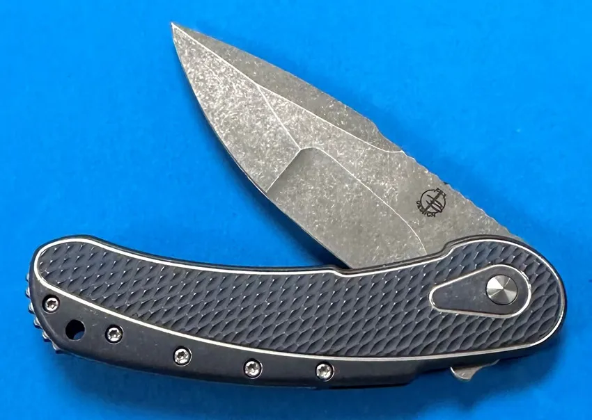 Begg Knives CH151 Item Description:Begg Knives Begg Knives Bodega CH151 on sale now for $1125.00. UPC code 871373620849. Made in USA. Begg Knives Bodega. 5 1/8” closed framelock folder. N690 steel distressed finish spear point blade features grooved thumb ramp and flipper. Blue anodized titanium handles with silver contrasts. Titanium backstrap. Distressed finish titanium pocket clip. Todd Begg design. Handmade in Petaluma, Ca. custom shop. Zippered storage pouch.