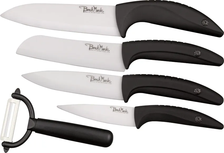 $59.95$39.59Benchmark BMK022 Item Description:The Benchmark Knives BMK022 Ceramic Kitchen Set outfits your culinary space with essential sharpness and style. This five-piece collection features durable ceramic blades known for their lasting edge retention and resistance to corrosion. Each knife, from the paring to the chef's knife, boasts an ergonomic handle for comfortable and controlled use. Prepare ingredients efficiently and enjoy a cleaner cut with this sleek and modern set that enhances both function and aesthetic in any kitchen.