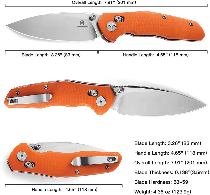 The Bestech Knives Ronan B-Lock in Orange (BRK-BTKMK02C) offers robust functionality and striking aesthetics. This knife features a durable CPM-S35VN steel blade known for its excellent edge retention and corrosion resistance. Its B-Lock mechanism ensures secure and ambidextrous operation. The vibrant orange-anodized titanium handle provides a comfortable and secure grip. A perfect blend of performance and style, the Ronan B-Lock is a reliable tool for everyday carry and outdoor adventures. 4.63" (11.76cm) closed. 3.25" (8.26cm) satin finish 14C28N Sandvik stainless blade. Orange G10 handle. Thumb stud. Pocket clip. Boxed.