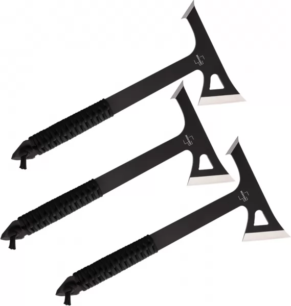 11" overall. 5.25" black finish 3Cr13 stainless axe head with 2.38" cutting edge. Black cord wrapped handle. Lanyard hole. Set of three. Sharpened end. Includes paper targets. Black nylon belt sheath. Boxed.