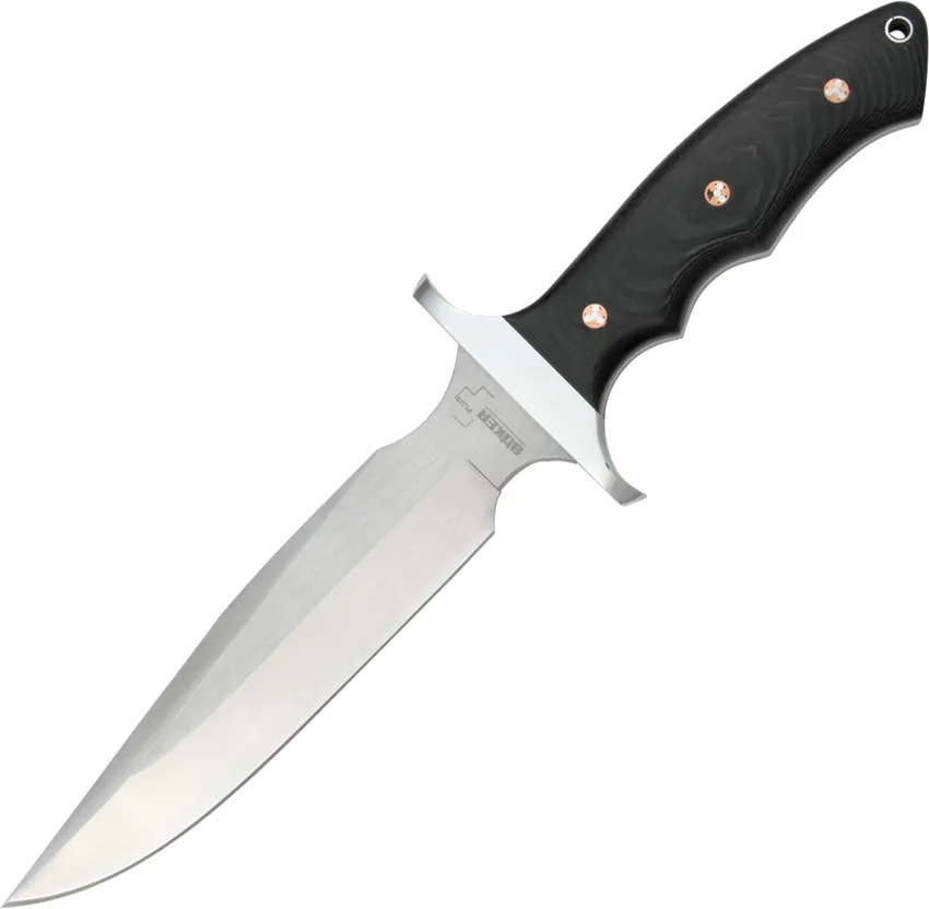 Boker Plus BOP02BO160 Item Description:Boker Plus Valkyrie knives BOP02BO160 on sale now for $134.96. UPC code 4045011044045. 12 5/8" overall. 7 1/4" 440C stainless blade. Full tang. Finger groove black micarta handles with polished stainless guard and mosaic handle pins. Lanyard hole. Black leather belt sheath.