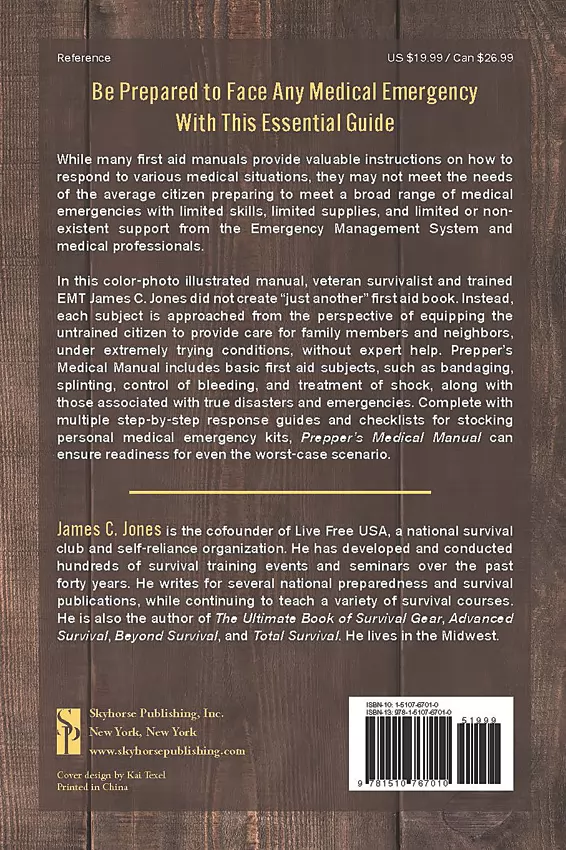The Ultimate Readiness Guide for Medical Emergencies in Disaster Situations. By James C. Jones- Cofounder of Live Free USA. Illustrated with color photos. Each subject is approached from the perspective of equipping the untrained citizen to provide care for family members and neighbors, under extremely trying conditions, without expert help. Bulk packed.