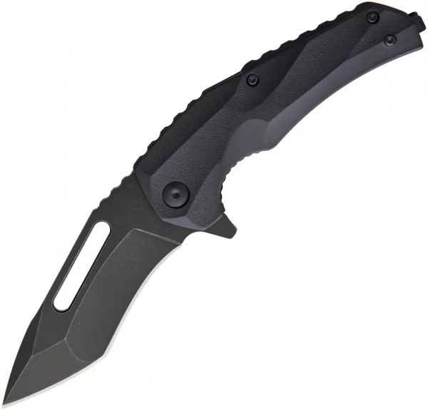4.75" (12.07cm) closed. 3.5" (8.89cm) acid washed finish stainless blade. Black contoured polymer handle. Extended tang. Thumb pull. Lanyard hole. Pocket clip. Boxed.