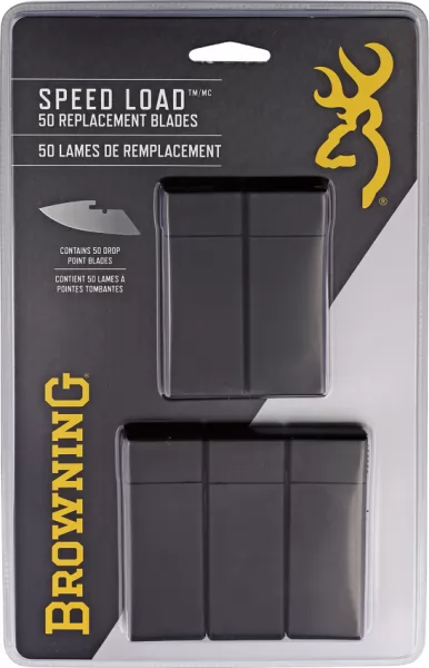 Browning BR1150 Item Description:Browning Replacement Blade 50pk knives BR1150 on sale now for $8.05. UPC code 023614490807. satin finish stainless blade. 50 drop point blades. Clam packed.