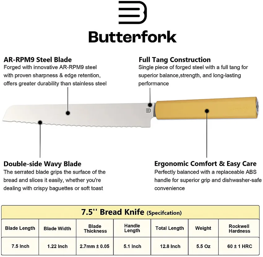 Butterfork Bread knives AR-RPM9 BF01BKYL on sale now for $54.99. UPC code 850066904084. There are 8 in stock.