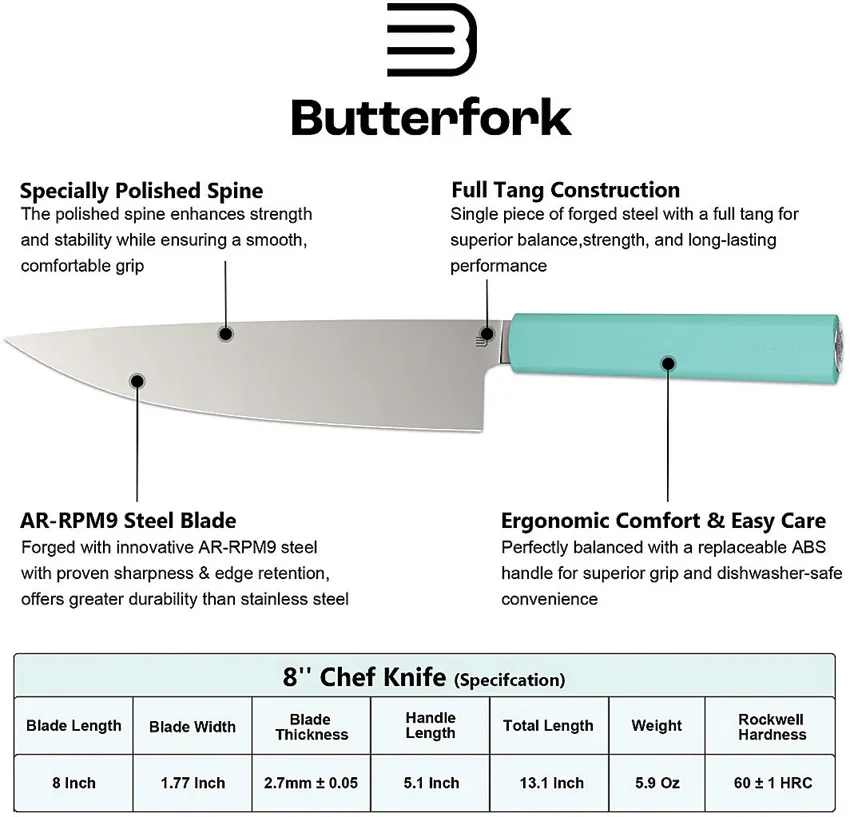 Butterfork Chefs knives AR-RPM9 BF01CKMT on sale now for $54.99. UPC code 850066904015. There are 8 in stock.