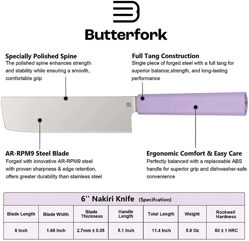 Butterfork Nakiri Knives AR-RPM9 BF01NKPP on sale now for $54.99. UPC code 850066904176. There are 8 in stock.