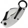 4.63" (11.76cm) closed. 2.75" (6.99cm) black stonewash finish AUS-10A stainless karambit blade. White G10 handle. Extended tang. Finger ring. Pocket clip. Black nylon zippered storage case. Boxed.