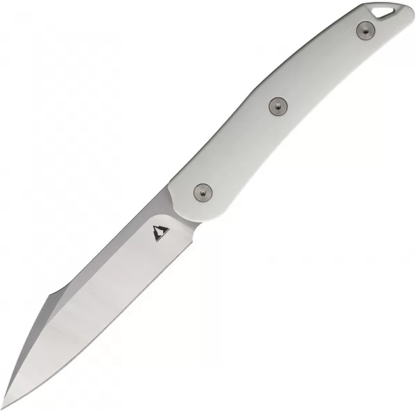 7.5" (19.05cm) overall. 3.5" (8.89cm) satin finish 14C28N Sandvik stainless blade. White G10 handle. Full tang. Lanyard hole. Green leather belt sheath. Boxed.