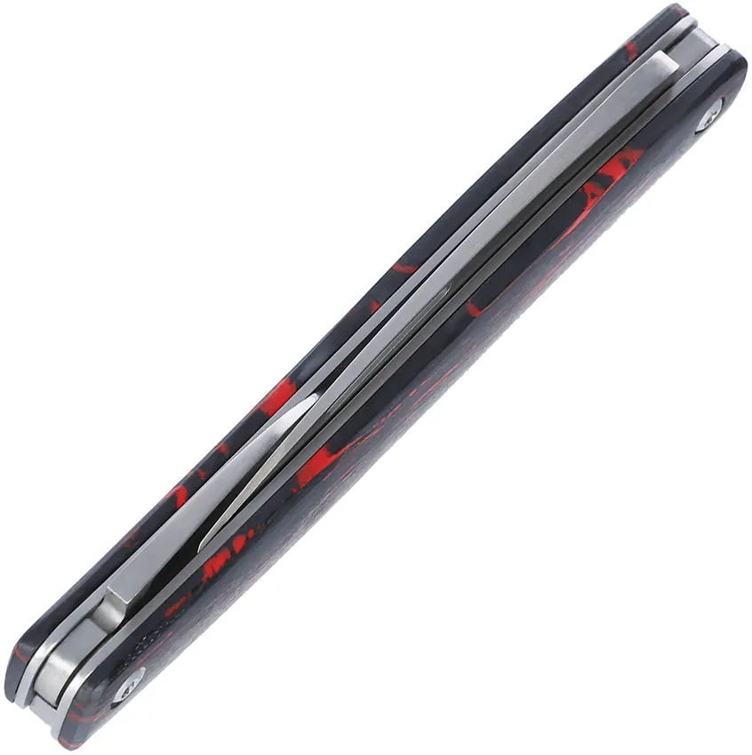 3.38" (8.59cm) closed. Satin finish 12C27 Sandvik stainless large and small Wharncliffe blades. Black and red G10 handle. Boxed.