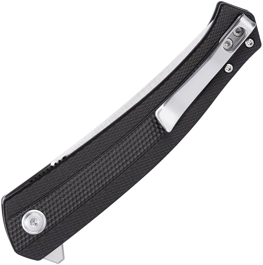 Assisted opening. 4.5" (11.43cm) closed. 3.5" (8.89cm) satin finish D2 tool steel blade. Black GRN handle. Extended tang. Pocket clip. Boxed.