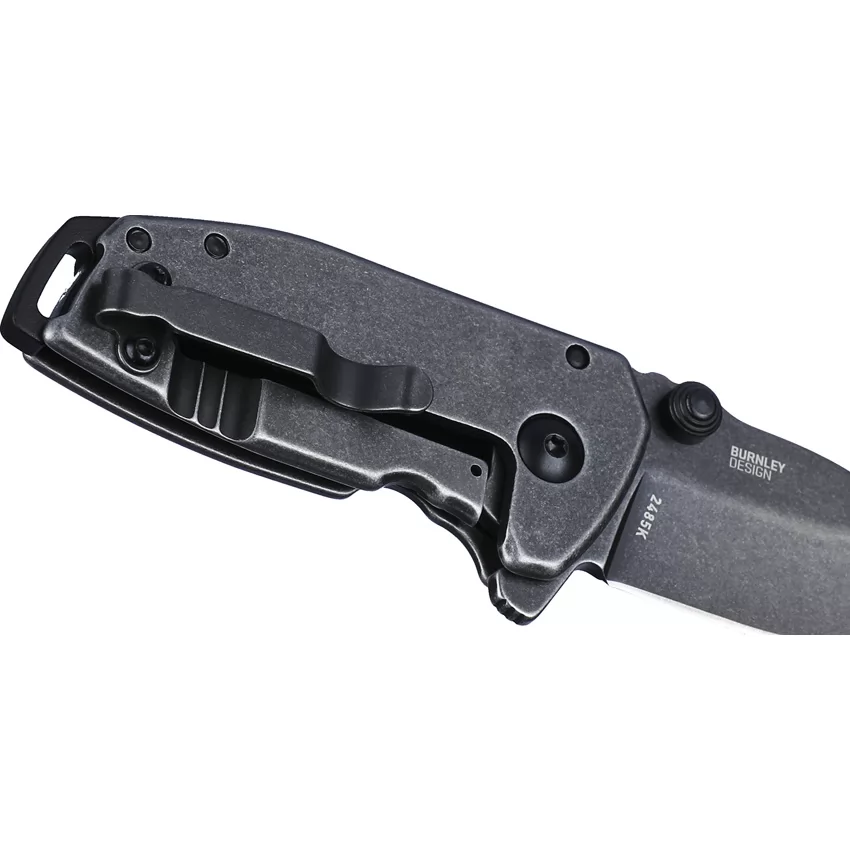 Assisted opening. 3" (7.62cm) closed. 1.75" (4.45cm) black stonewash finish 8Cr13MoV stainless blade. Black stonewash finish stainless handle. Extended tang. Lanyard hole. Pocket clip. Thumb stud. Designed by Lucas Burnley. Boxed.