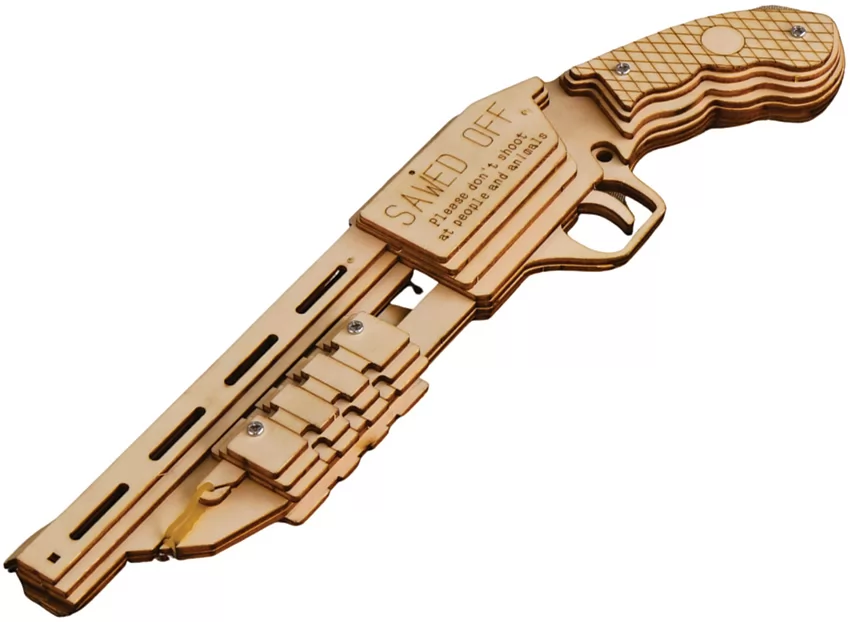 Shoots rubber bands once completed. No tools needed to assemble. Wood pieces are laser cut for easy assembly. Boxed.