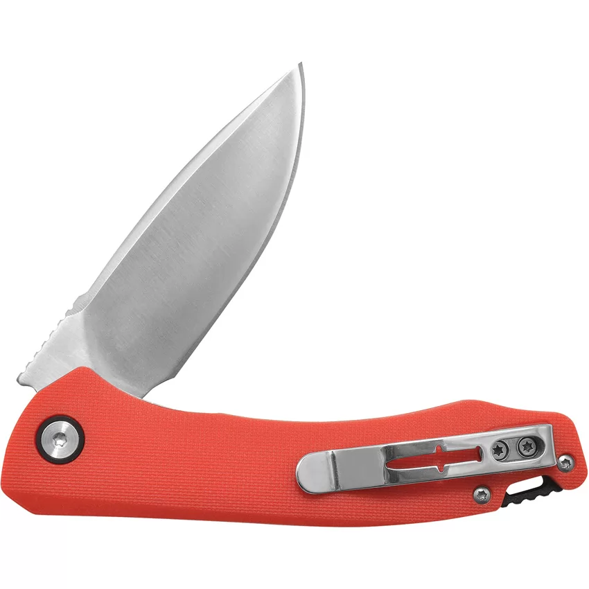 Assisted opening. 4.75" (12.07cm) closed. 3.25" (8.26cm) satin finish 420 stainless blade. Red GFN handle. Extended tang. Lanyard hole. Pocket clip. Clam packed.