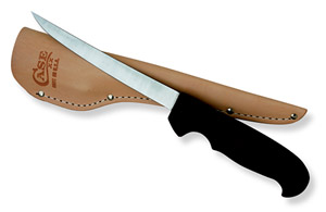 Case 342 Item Description:Case 00342 Fillet Knife - 6-inch (BR12-6 SS) with Leather Sheath. Black handle. 6 inch blade. Knife comes enclosed in lite brown leather sheath.