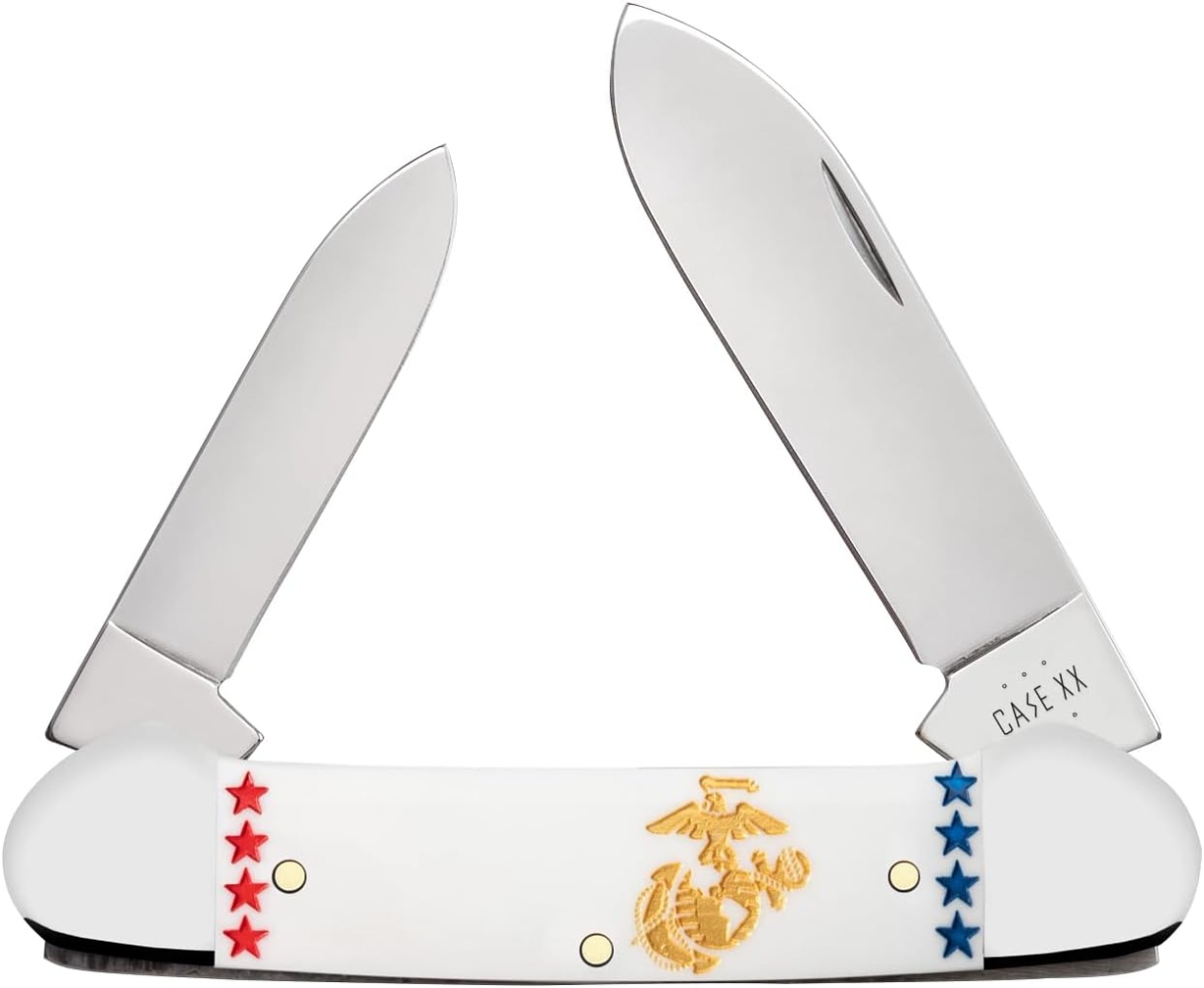 $86.32Case 13205 Item Description:The Case Knives USMC SM WHITE SYNTHETIC CANOE (model 13205) is a testament to enduring quality and patriotic spirit. This classic canoe pocket knife features smooth white synthetic handles proudly emblazoned with the USMC emblem, making it a cherished piece for collectors and everyday users alike. Crafted with Case's Tru-Sharp surgical steel blades, it delivers reliable performance for a multitude of tasks. The traditional canoe shape offers a comfortable grip and easy carry, solidifying its place as a dependable and handsome addition to any knife collection.