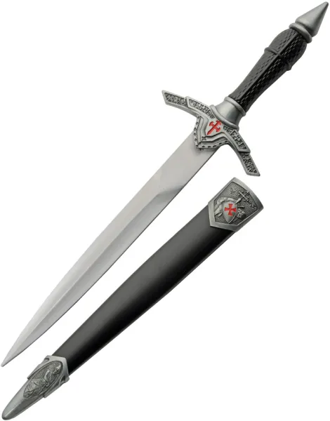 14.75" (37.47cm) overall. 8.5" (21.59cm) satin finish stainless dagger blade. Black ABS handle. Silver finish zinc alloy guard, pommel, and fittings. Black ABS scabbard.