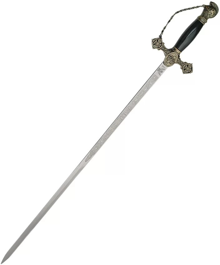 37" (93.98cm) overall. 30" (76.2cm) stainless blade. Black synthetic handle. Metal alloy guard and pommel. Blade etching. Metal scabbard. Boxed.