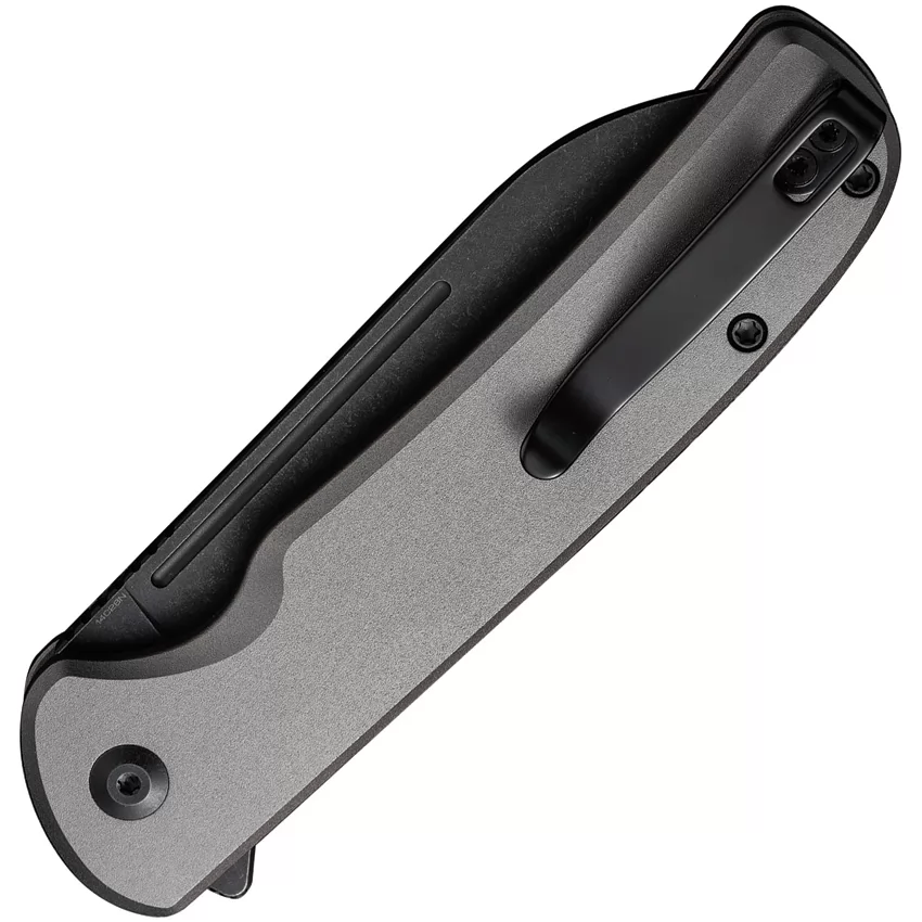 4.5" (11.43cm) closed. 3.5" (8.89cm) black stonewash finish 14C28N Sandvik stainless blade. Gray aluminum handle. Extended tang. Pocket clip. Black nylon zippered storage case. Boxed.