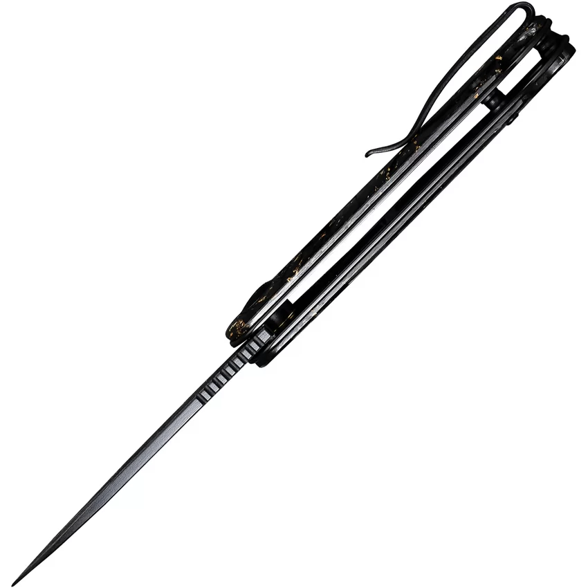4" (10.16cm) closed. 3" (7.62cm) Damascus steel blade. Extended tang. Lanyard hole. Pocket clip. Black hand rubbed finish blade. Golden shred in clear resin and shredded carbon fiber handle. Black nylon zippered storage case. Boxed.