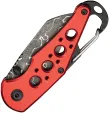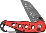 3.5" (8.89cm) closed. 2.25" (5.72cm) Damascus steel Wharncliffe blade. Red aluminum handle. Attachment clip. Bottle opener. Lanyard hole. Thumb stud. Boxed.