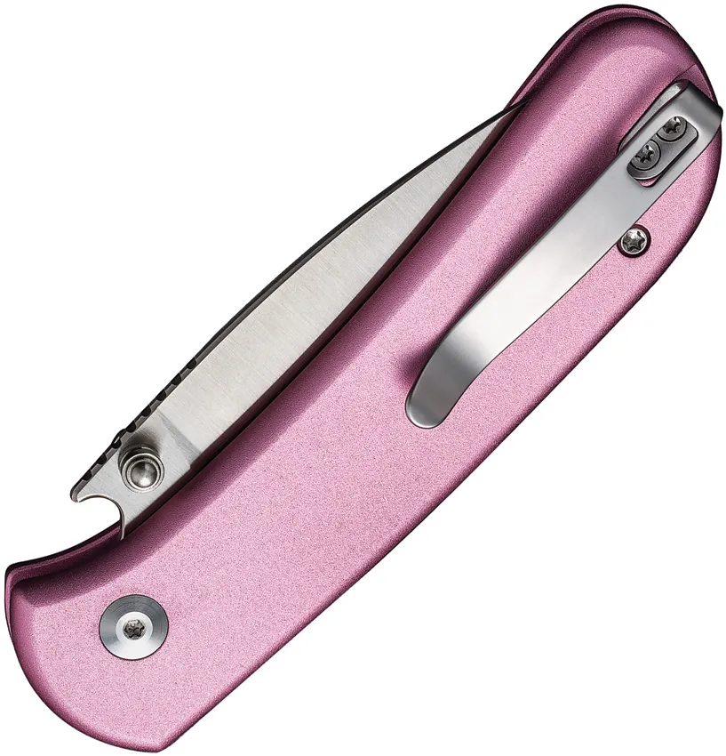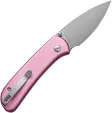 4" (10.16cm) closed. 3" (7.62cm) satin finish 14C28N Sandvik stainless blade. Pink aluminum handle. Thumb stud. Pocket clip. Black nylon zippered storage case. Boxed.