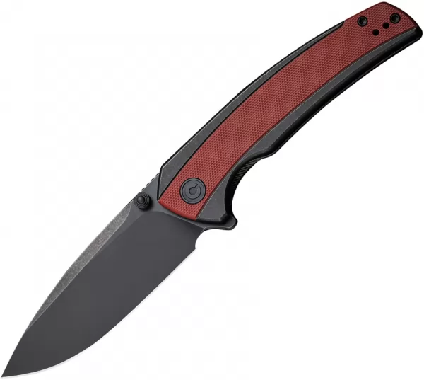 4.5" (11.43cm) closed. 3.5" (8.89cm) black stonewash finish Nitro V steel drop point blade. Black stonewash finish stainless handle with Burgundy G10 inlay. Extended tang. Thumb stud. Pocket clip. Black nylon zippered storage case. Boxed.