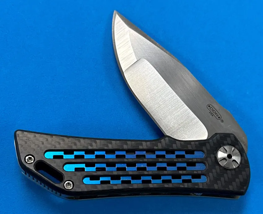 Darrell Ralph Custom Dominator. Very prolific tactical maker who recently passed away. 4 5/8” closed framelock. Satin finish CPM 3V steel multi grind clip point blade features thumb ramp and flipper. Carbon fiber front handle scale with skeletonized blue anodized titanium insert. Titanium pocket clip. No box. Includes zippered storage pouch.