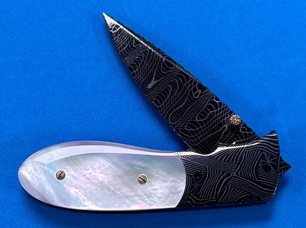 Jeff Chaffee Custom Linerlock. Quality maker and former Knifemakers Guild member from Morris, IN. 3 1/16” closed. Hot blued Damascus steel blade features fileworked spine and gold thumb stud. Mother of pearl handle scales with gold pins. Hot blue Damascus steel bolster. Blue anodized titanium liners. Fileworked Damascus steel spine. Comes in zippered storage pouch.