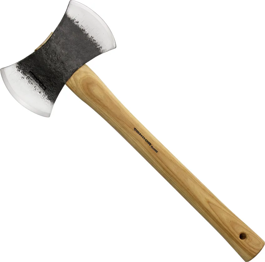 The Condor CTK4051C175 Double Bit Michigan Axe provides unparalleled versatility and performance for serious outdoorsmen. Forged from durable 1045 high carbon steel and boasting a carefully crafted American hickory handle, this axe conquers splitting, chopping, and felling tasks with ease. Its classic Michigan pattern heads ensure balanced strikes, maximizing efficiency and minimizing fatigue. A durable leather sheath protects the axe during transport and storage, making this a reliable companion for years of hard use. 26" overall. 7.25" carbon steel axe head with 4" cutting edge. American Hickory handle. Black leather belt sheath.