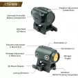 Dimensions: 2.7" x 2.1" x 2.5". Actual magnification: 1x. Shockproof. Waterproof. Fogproof. 2.0 MOA round aiming dot. Quick disconnect (QD) M1913 Picatinny rail mount, full co-witness height. 10 levels of brightness with intelligent power management. Advanced notch coating for maximum clarity. High efficiency LED. Adjustment range: >100 MOA. Adjustment gradutation: 1 MOA. Requires (1) CR2032 battery (included). Black aluminum construction. Boxed.