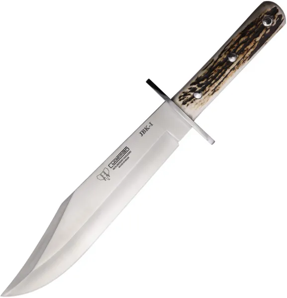 15" (38.1cm) overall. 10" (25.4cm) satin finish Vanadium molybdenum steel bowie blade. Stag handle. Steel guard. Brown leather belt sheath. Boxed.