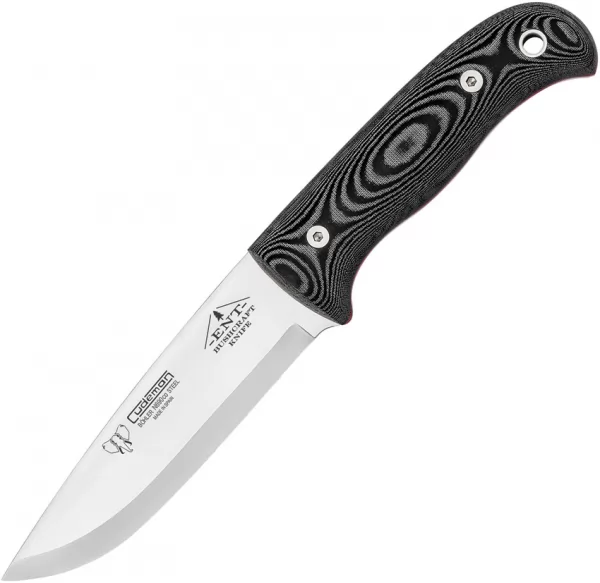 9.5" (24.13cm) overall. 4.75" (12.07cm) satin finish Bohler N690 stainless blade. Black canvas micarta handle. Full tang. Lanyard hole. Red liners. Black leather belt sheath. Boxed.