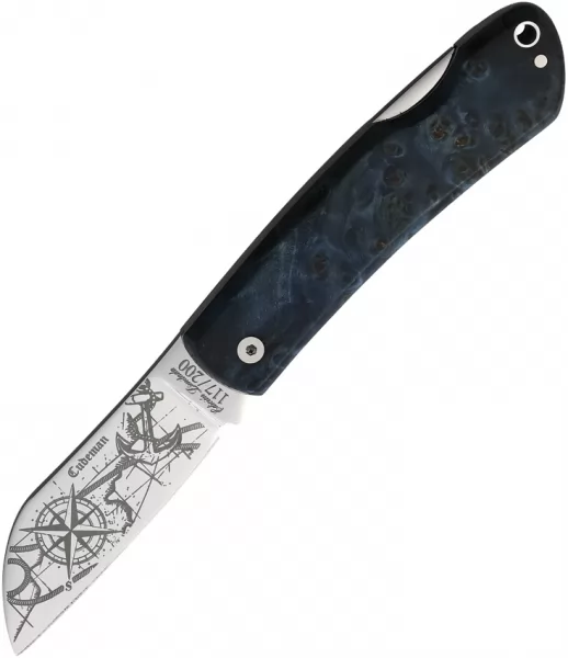 3.75" (9.53cm) closed. 2.75" (6.99cm) mirror finish Bohler N690 stainless blade. Blade etching. Lanyard hole. Blue stabilized poplar handle. Serialized limited edition of 200. Gift boxed.