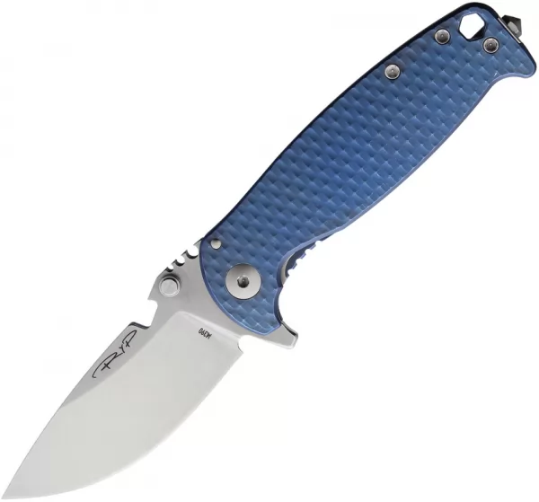 4.5" (11.43cm) closed. 3.25" (8.26cm) stonewash finish Bohler M390 stainless drop point blade. Blue textured titanium handle. Extended tang. Thumb stud. Glass breaker. Pocket clip. Blade notch doubles as bottle opener and quick open feature. Integral Hex drive. Tri-gauge wire stripper jimping. Boxed.