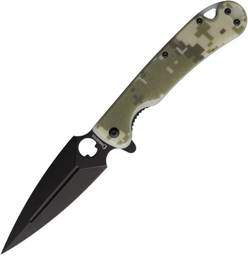 The Daggerr Knives Arrow Linerlock Camo (BRK-DGR1CAMDLC) is a precision-crafted tool built for rugged utility and reliable performance. This knife features a durable, DLC-coated blade with exceptional edge retention, housed in a lightweight yet sturdy camo-patterned handle that offers a secure and comfortable grip. The smooth linerlock mechanism provides effortless one-handed operation and secure blade lockup. Perfect for everyday carry, outdoor adventures, or tactical situations, the Arrow delivers cutting-edge design and dependable functionality.