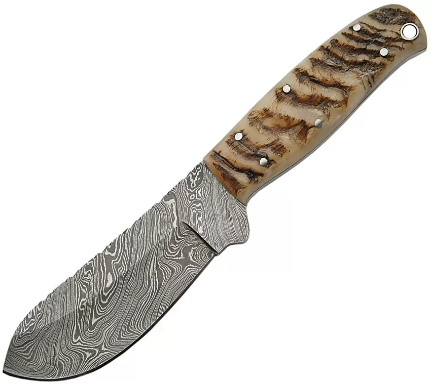 Damascus DM1070 Item Description:Damascus Big Game Skinner Ram Horn knives DM1070 on sale now for $39.50. UPC code 801608210705. 8" overall. 4.25" Damascus steel skinner blade. Ram's horn handle. Full tang. Lanyard hole. Brown leather belt sheath. Boxed.