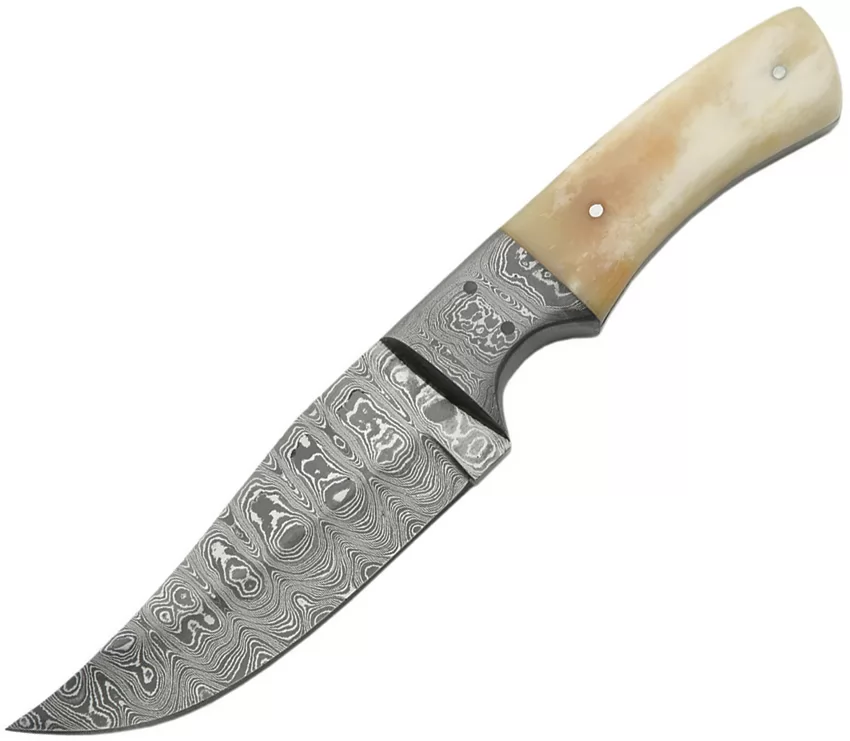 Damascus DM1051BO Item Description:Damascus Clip Point Hunter knives DM1051BO on sale now for $42.42. UPC code 801608110517. 8 1/2" overall. 4 1/4" damascus steel clip point blade. Full tang. White smooth bone handles. Damascus bolster guard. Brown leather belt sheath.