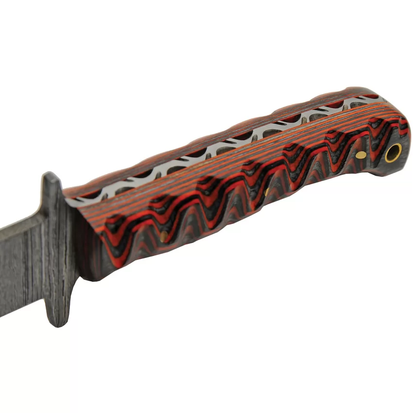 10.5" (26.67cm) overall. 6" (15.24cm) Damascus steel blade. Black and red sculpted wood handle. Full tang. Lanyard hole. Brown leather belt sheath. Boxed.